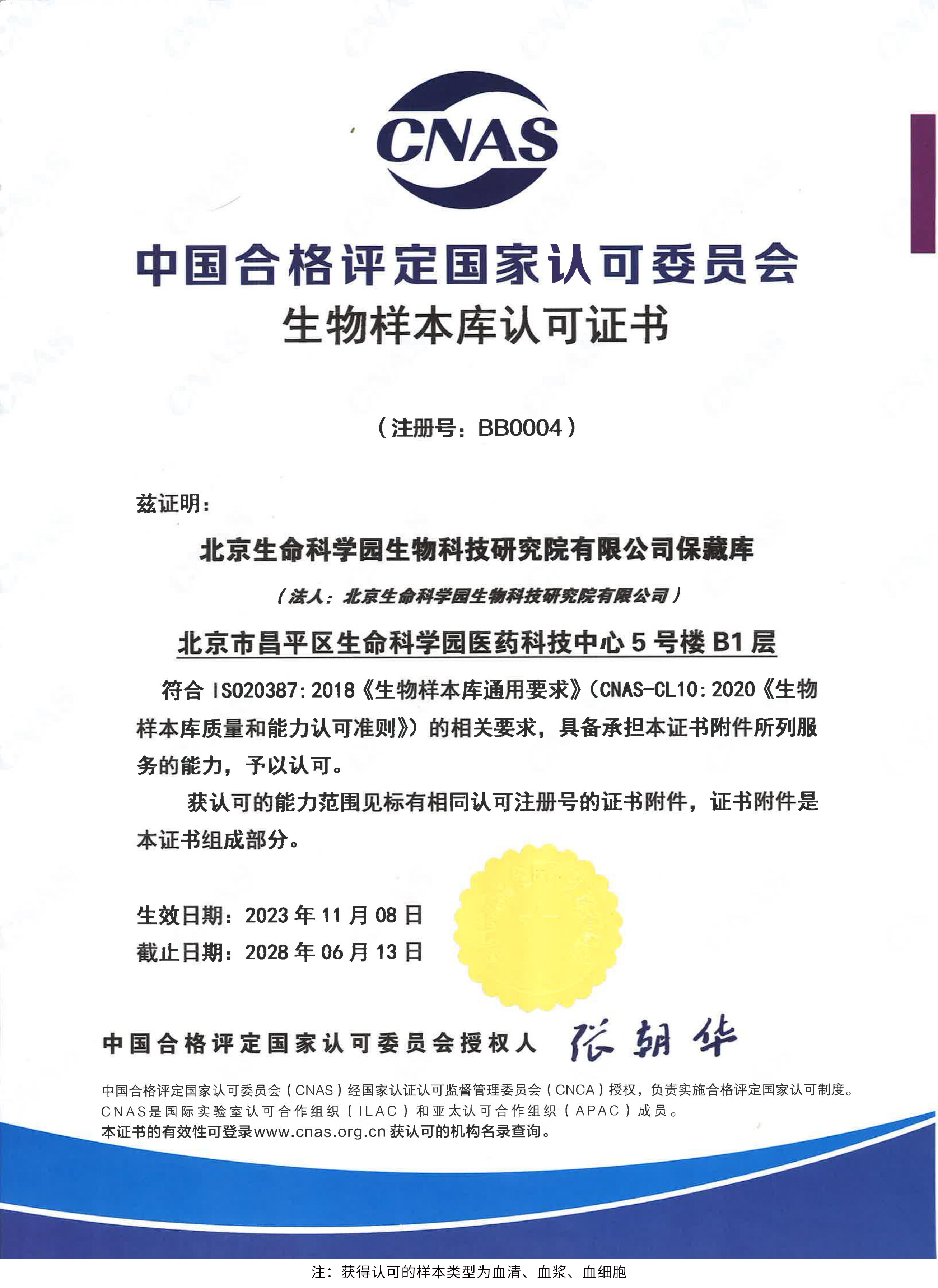 北京生命科學園生物科技研究院(以下簡稱“北京生物樣本資源庫”)(Biobank of Life Science Park,簡寫“BoLSP”)是一家由北京市科委和中關村生命科學園共同支持設立的第三方生物樣本庫公共服務平臺,秉承北京重大疾病臨床數據和樣本資源庫(以下簡稱“北京庫”)(Beijing Biobank of Clinical Resources,BBCR)十余年的發(fā)展成果,聚合眾多臨床樣本專家的專業共識,致力于在生命科學、生物醫(yī)藥研究領域發(fā)揮銜接樣本資源持有者與研究者的橋梁作用,解決生物樣本資源開發(fā)上下游信息不對稱、資源共享困難等問題。研究院在北京中關村生命科學園昌平園區建立了2000㎡生物樣本庫,最大存儲規(guī)模達1000萬份。研究院遵循CNAS-CL10:2020《生物樣本庫質量和能力認可準則》,同時結合北京庫過去十年的工作經驗與教訓,建立了一套完善的生物樣本保藏質量管理體系,從人、機、料、法、環(huán)、控多個角度,實現生物樣本保藏過程的全面質量控制,先后獲得國家科技部頒發(fā)的人類遺傳資源保藏行政許可證書和中國合格評定國家認可委員會(China National Accreditation Service for Conformity Assessment,CNAS)頒發(fā)的“CNAS認可證書”。
